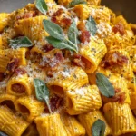 Add your drained rigatoni to the skillet, tossing it well to coat every piece with that creamy pumpkin sage sauce. Don’t forget to fold in the grated Parmesan cheese and half of that crispy pancetta. Adjust the seasoning with salt and pepper as needed for perfection.
