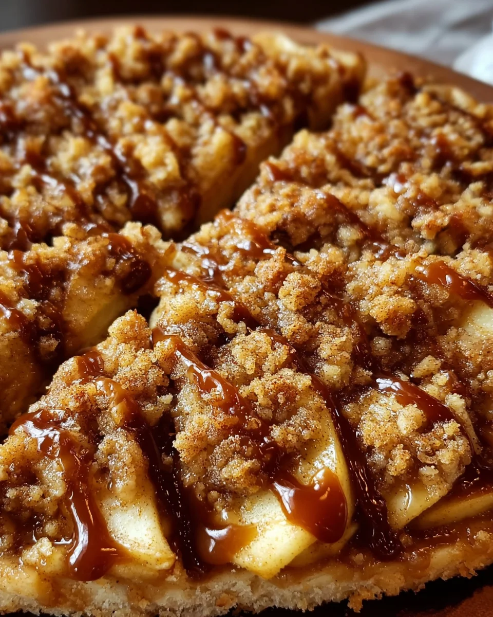 A delicious apple crisp pizza dessert combining the flavors of apple pie and a crispy oat topping for a delightful treat.