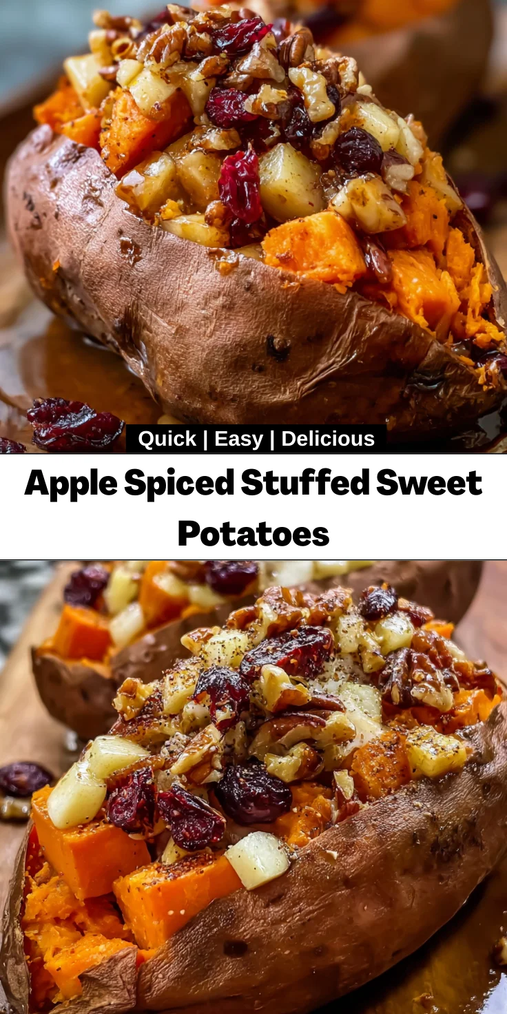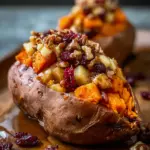 Apple Spiced Stuffed Sweet Potatoes are a cozy and delicious treat, perfect for fall, combining sweet potatoes with spiced apples, pecans, and cranberries.