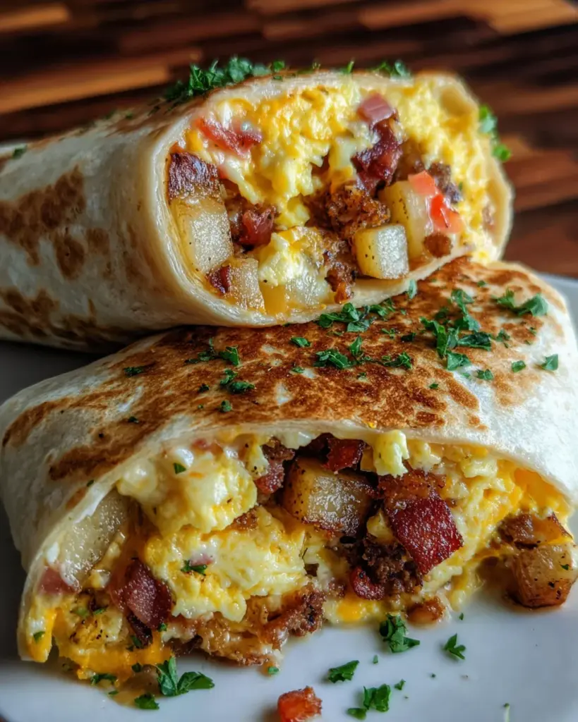 A delicious Bacon Egg Cheese Breakfast Burrito filled with scrambled eggs, cheese, breakfast sausage, and crispy bacon, perfect for a quick and satisfying meal.