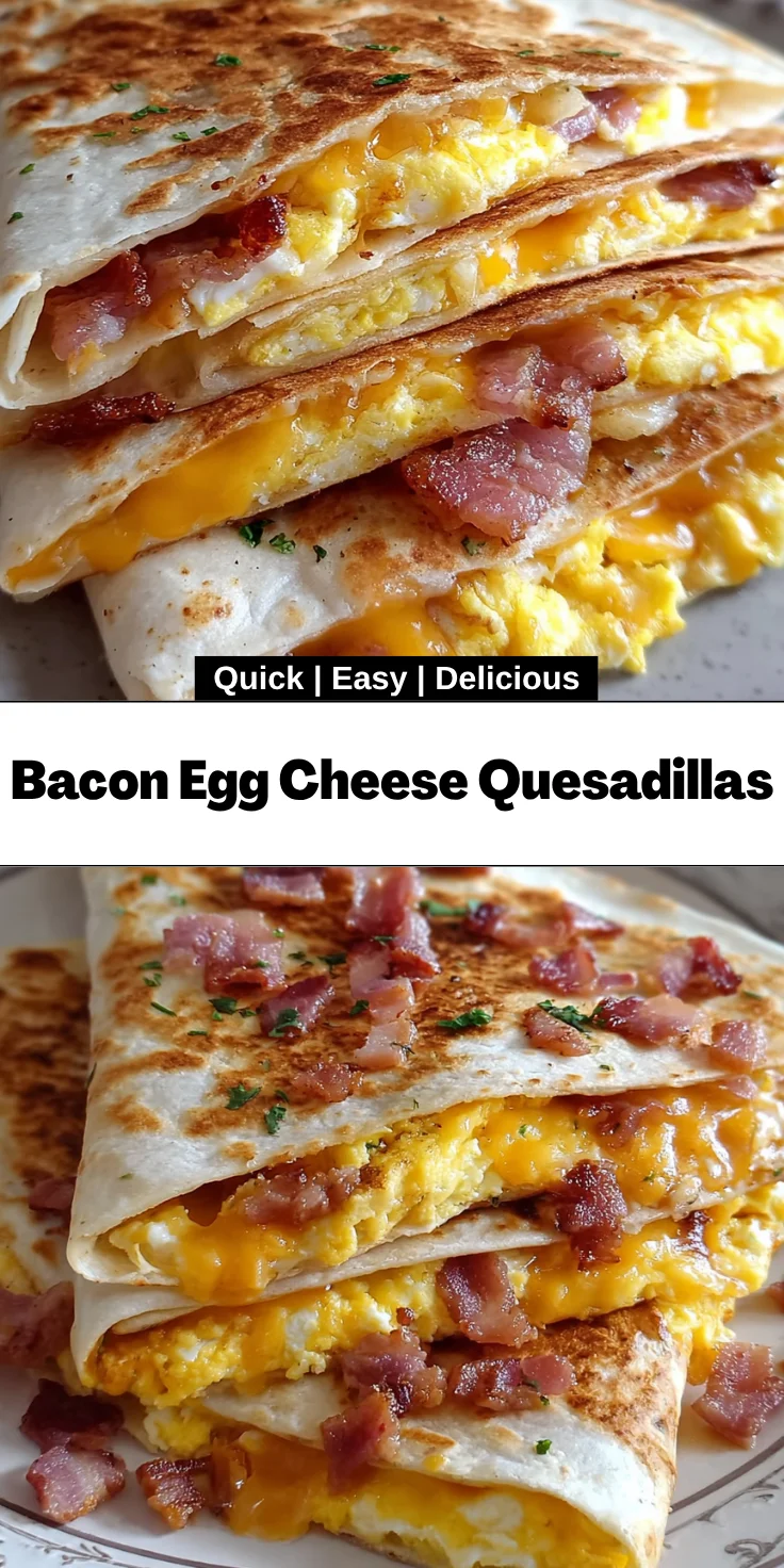Bacon Egg Cheese Quesadillas are more than just a meal—they’re a delightful experience! They bring together convenience and flavor, making breakfast easy and enjoyable on hectic mornings. The crispy bacon, fluffy eggs, and melting cheese create a symphony of taste that’s hard to resist. I always feel accomplished serving these to my family, knowing they’ll be smiling with every bite. Plus, their customizable nature means everyone can have their favorite twist. Whether it’s for breakfast or a quick snack, these quesadillas never fail to satisfy. I hope you find as much joy in making—and eating—these as I do!