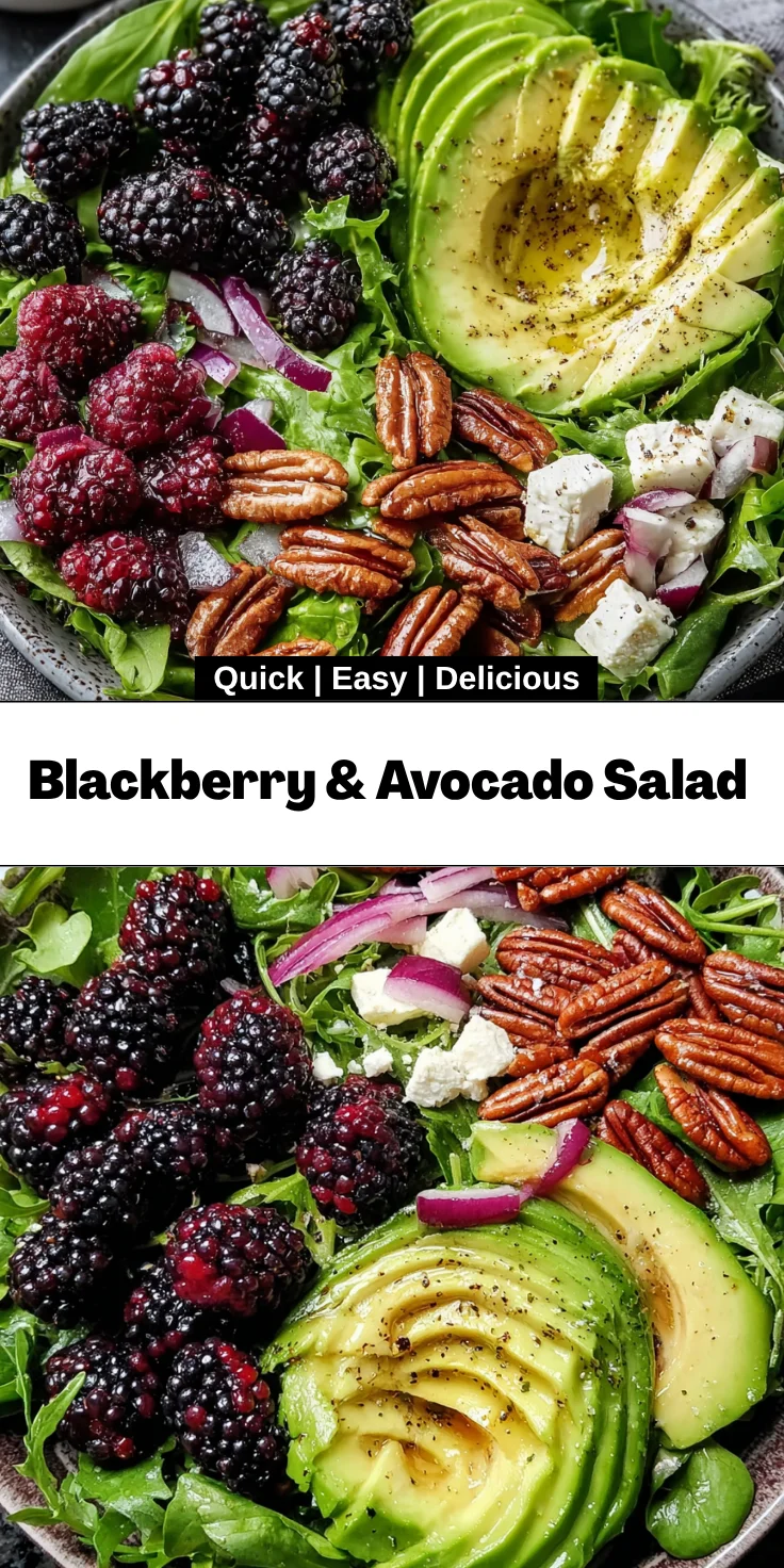 - In a large bowl, combine mixed greens, blackberries, avocado slices, crumbled feta, toasted pecans, and red onion.