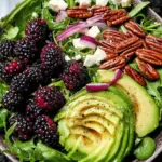 Now let’s layer the magic! In a large mixing bowl, toss together the mixed greens, fresh blackberries, creamy avocado slices, crumbled feta, toasted pecans, and red onion.