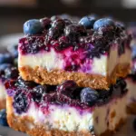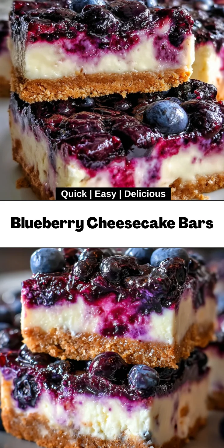 Blueberry Cheesecake Bars are a delightful dessert combining a creamy cheesecake layer with a sweet blueberry topping, all resting on a buttery graham cracker crust.