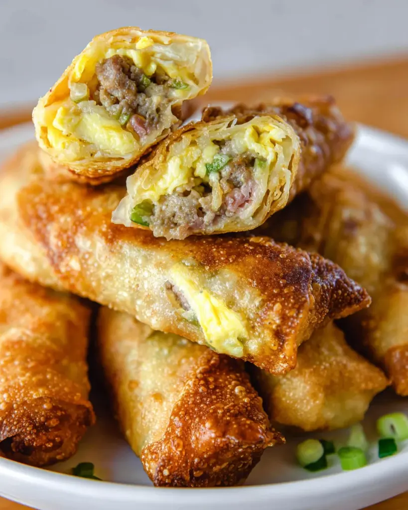Breakfast Egg Rolls are a savory breakfast treat filled with sausage, vegetables, eggs, and cheese, all wrapped in a crispy egg roll shell.