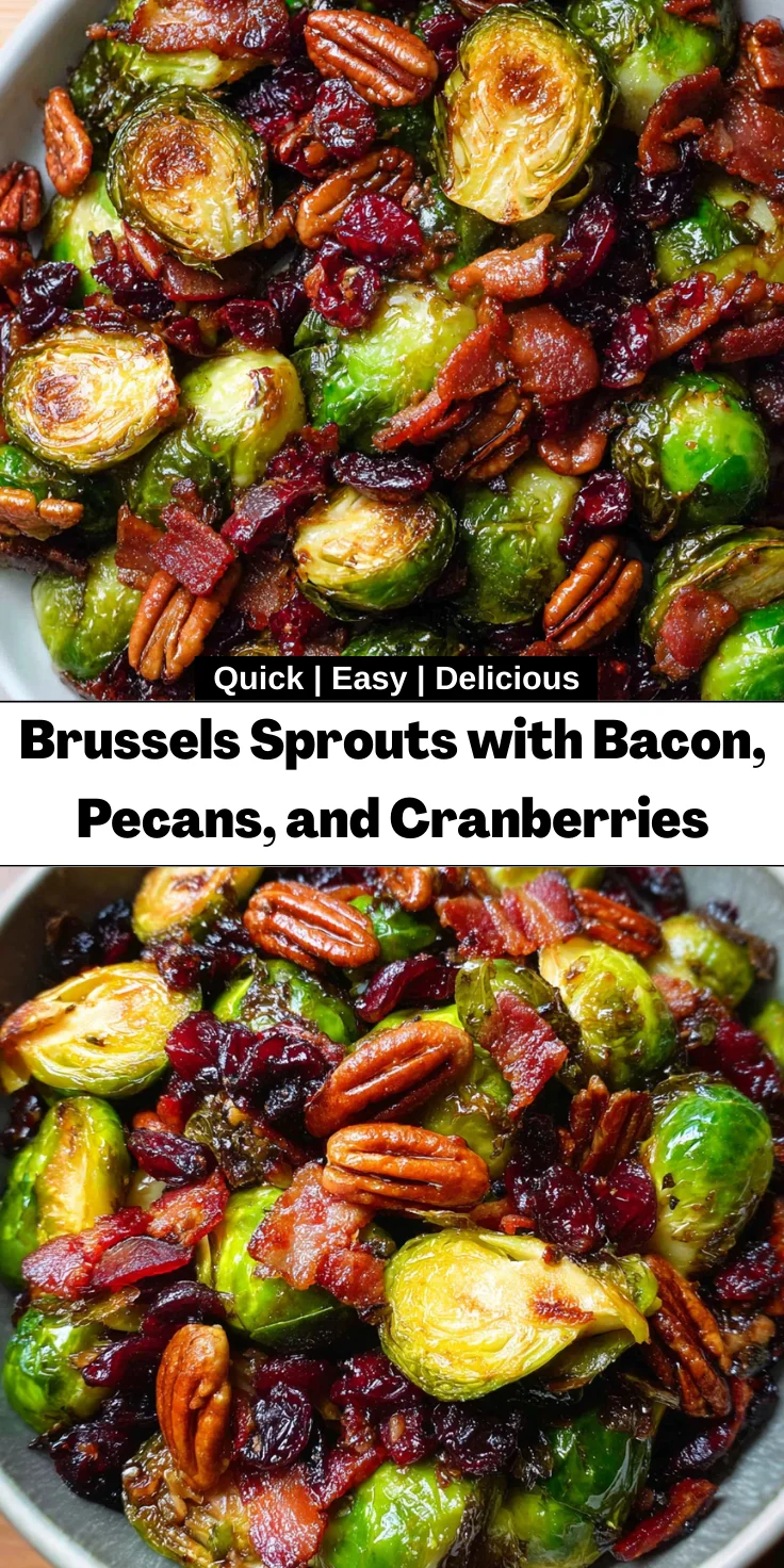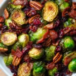 A delicious and savory dish featuring roasted Brussels sprouts, crispy bacon, toasted pecans, and sweet dried cranberries, perfect for any occasion.