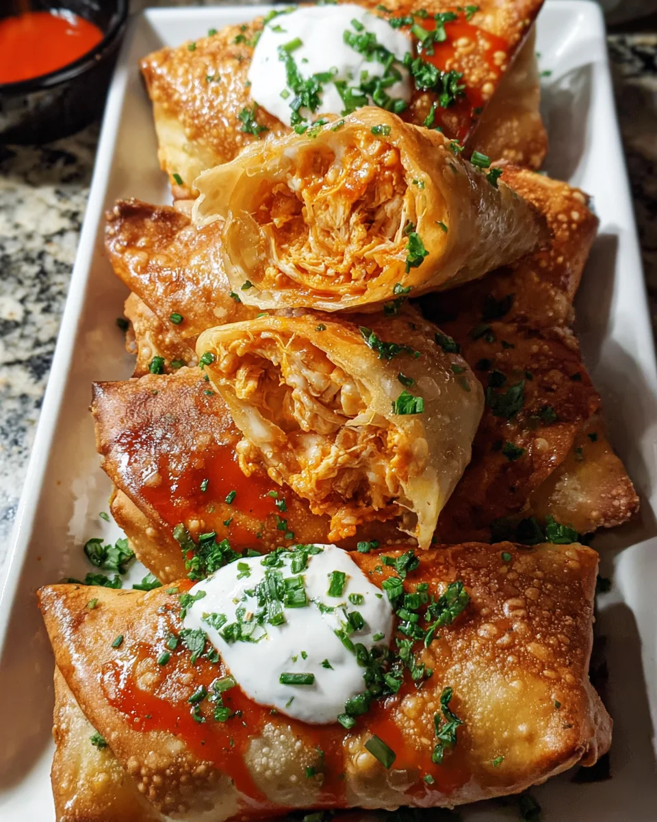 - Present hot egg rolls with ranch or blue cheese dressing and extra buffalo sauce as desired.