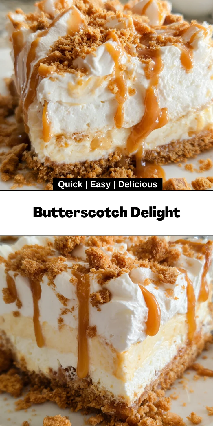 Butterscotch Delight is an indulgent, layered dessert made with cinnamon graham crackers, cream cheese, butterscotch pudding, and Cool Whip, perfect for any occasion.