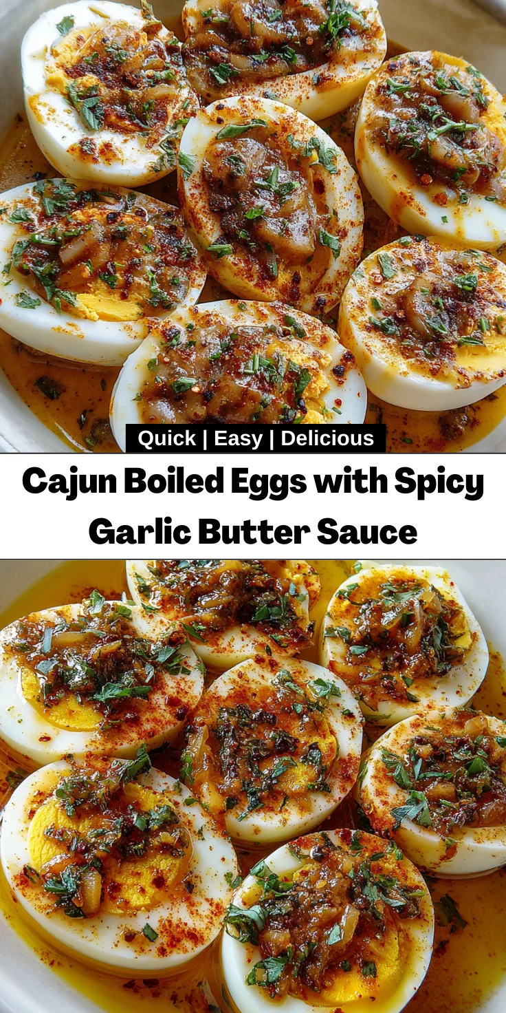 A delicious recipe for Cajun Boiled Eggs topped with a spicy garlic butter sauce, perfect as an appetizer or snack.