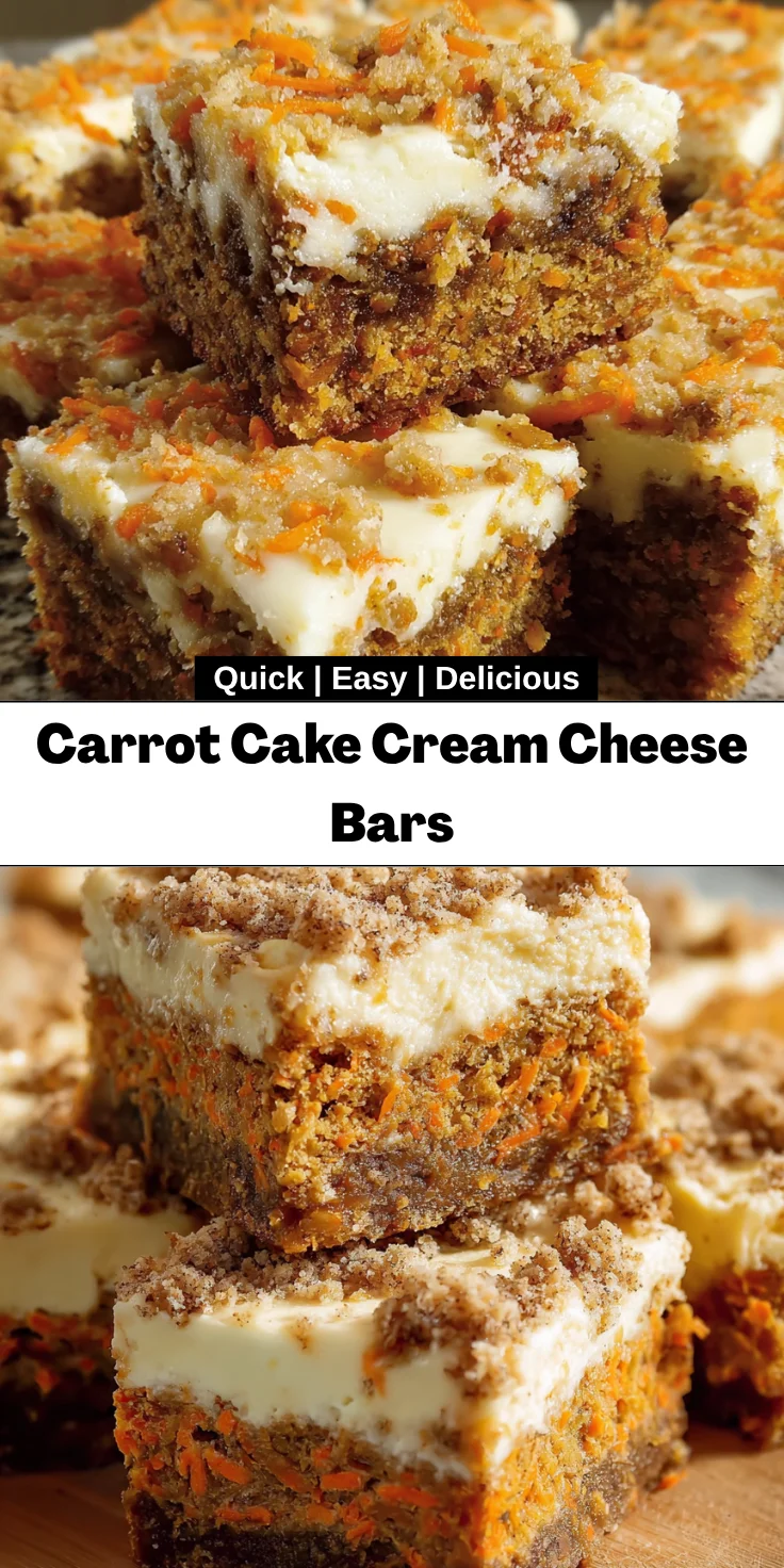 Delicious carrot cake bars topped with a creamy cream cheese layer, perfect for dessert or a sweet treat.