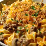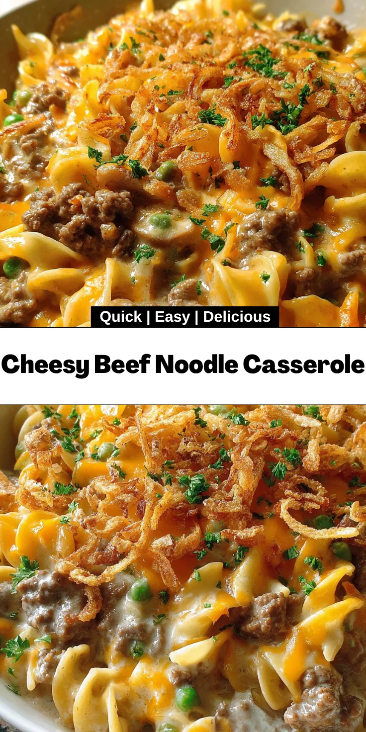 Cheesy Beef Noodle Casserole is a comforting dish that combines ground beef, egg noodles, and creamy sauce, topped with crispy French onions for added flavor and texture.