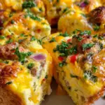 A delicious frittata made with biscuits, eggs, cheese, and vegetables, perfect for a hearty breakfast.