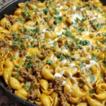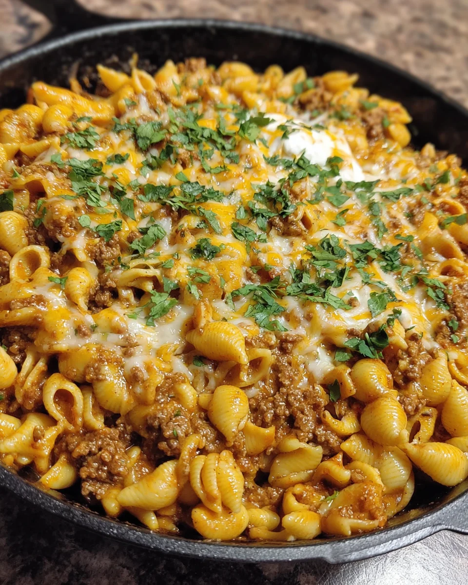 Now comes the moment we’ve been waiting for! Take the skillet off the heat and garnish your cheesy creation with fresh cilantro and a dollop of sour cream. This not only enhances the beauty of the dish but adds a lovely burst of freshness. Serve it warm in bowls, with maybe a crusty bread or tortilla chips on the side. Grab your forks, gather the family, and enjoy this delightful one-pan meal—your Cheesy Enchilada Hamburger Helper is ready!