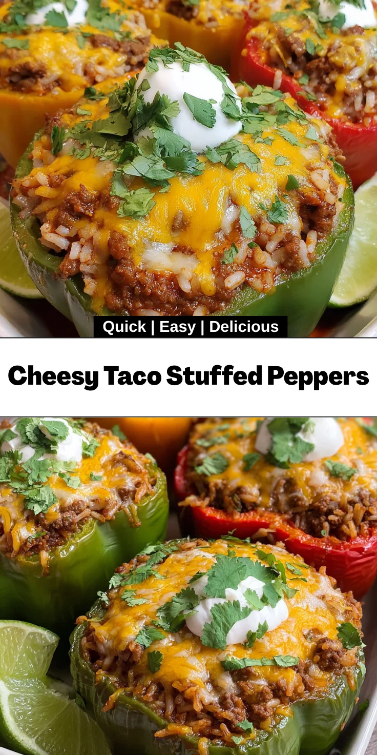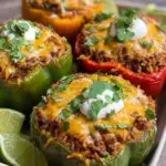 A delicious dinner idea featuring bell peppers stuffed with a cheesy taco rice filling.