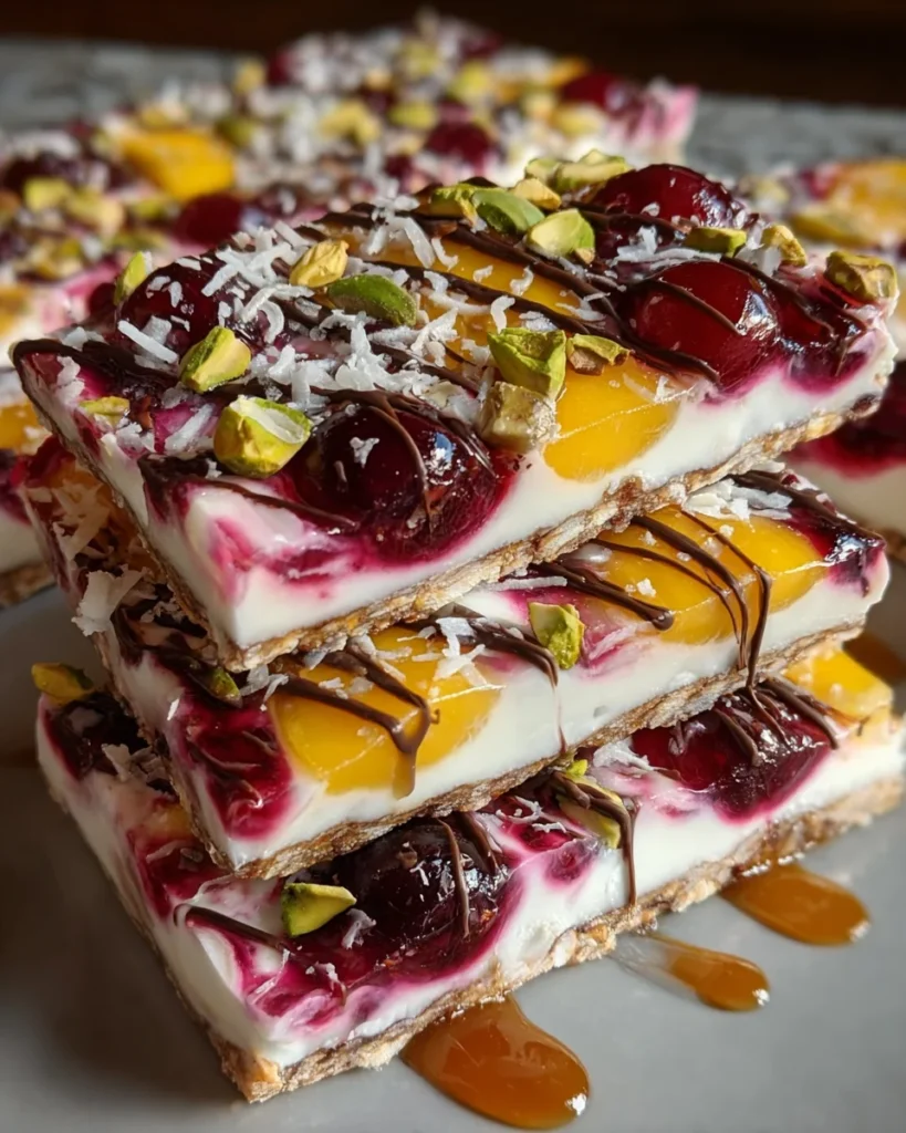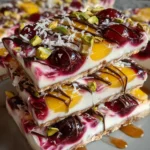 - Add Cherry Layer: Evenly scatter the quartered cherries across the yogurt bark. Drizzle with cherry jam.