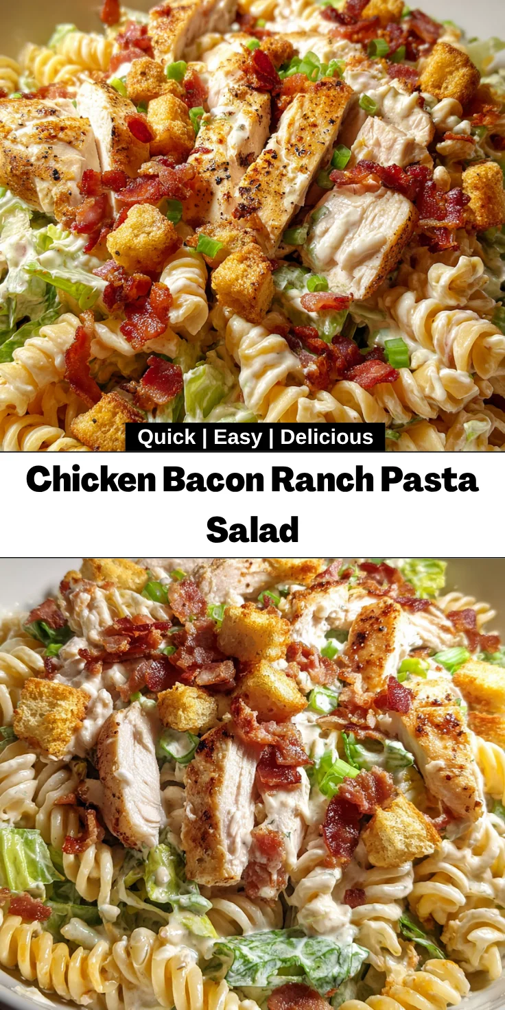A flavorful chicken bacon ranch pasta salad that combines tender chicken, crispy bacon, and fresh vegetables dressed in a creamy ranch dressing.
