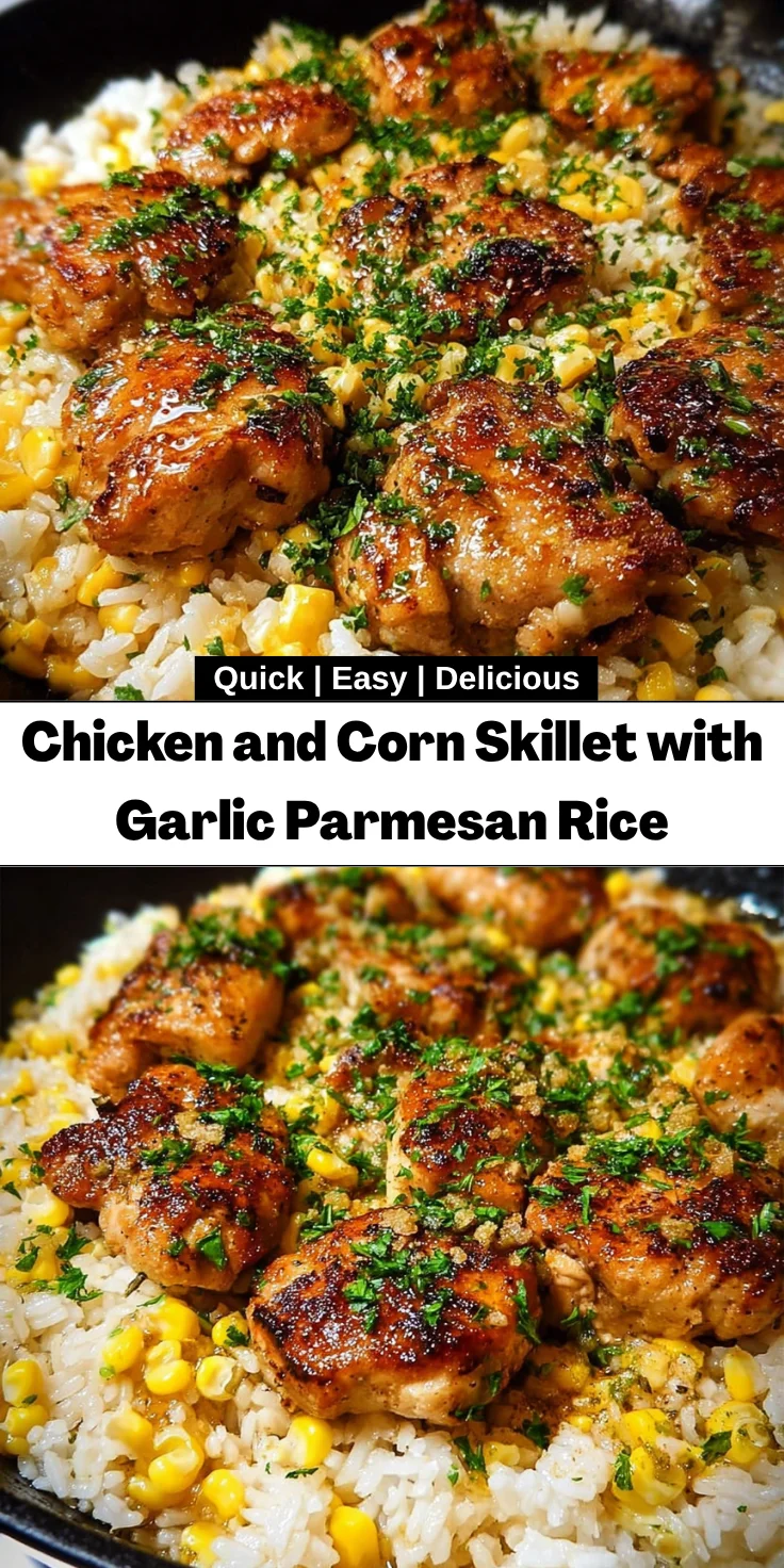 A delicious Chicken and Corn Skillet with creamy Garlic Parmesan Rice, perfect for a hearty meal.