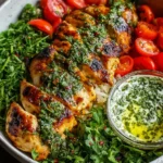Finally, it’s presentation time! Divide the fresh spinach or arugula between your serving bowls. Lay the sliced grilled chicken on top, drizzle generously with chimichurri sauce, and add a sprinkling of diced tomatoes for a fresh touch.