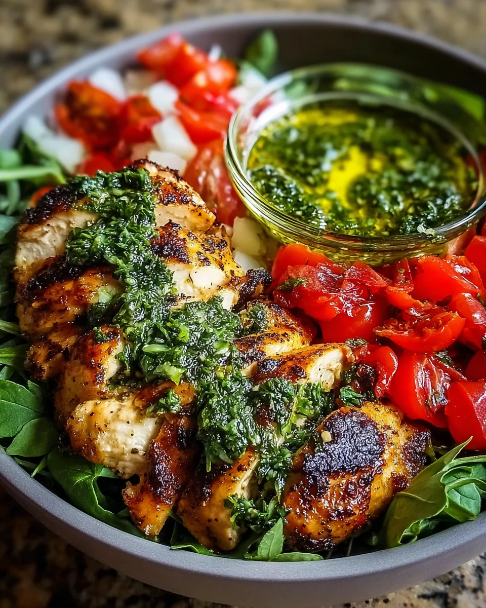 Finally, it’s presentation time! Divide the fresh spinach or arugula between your serving bowls. Lay the sliced grilled chicken on top, drizzle generously with chimichurri sauce, and add a sprinkling of diced tomatoes for a fresh touch.