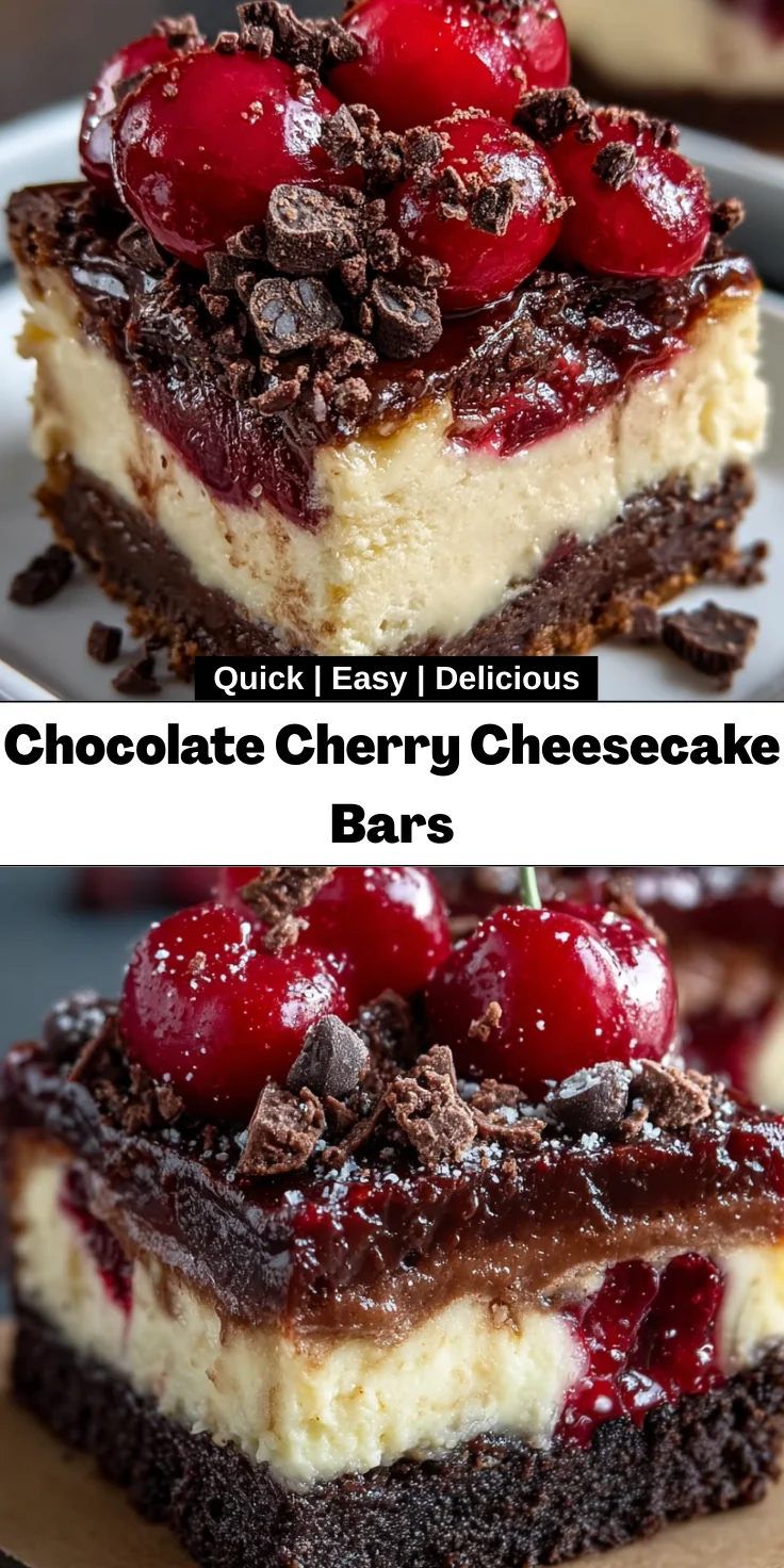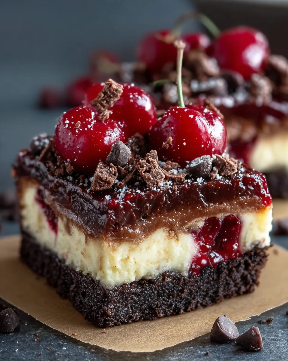 Delicious chocolate cherry cheesecake bars that offer a creamy texture and a delightful burst of cherry flavor.