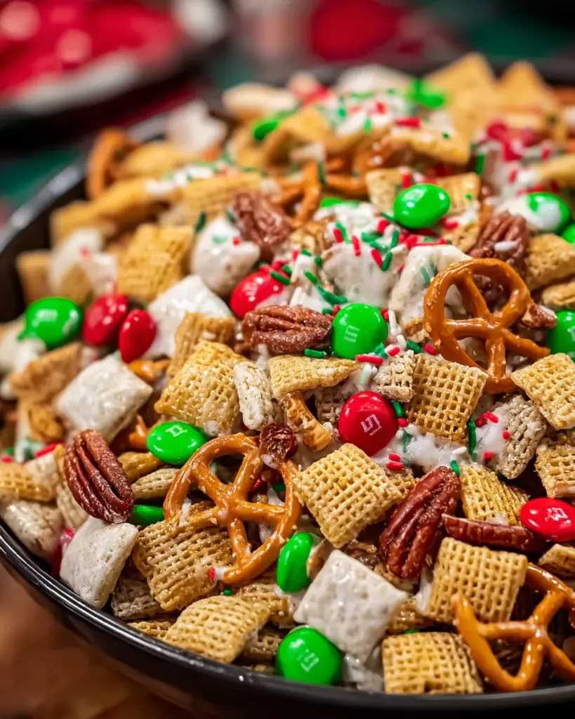 For a festive presentation, serve your Christmas Chex mix in a cheerful holiday bowl, perhaps even garnished with a few extra red and green M&Ms on top.