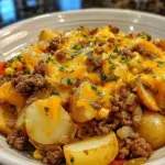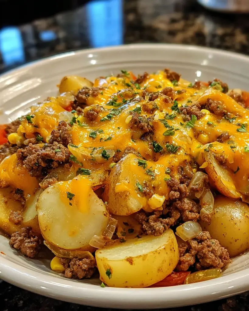 A hearty and comforting casserole featuring ground beef, potatoes, and vegetables, topped with melted cheddar cheese.