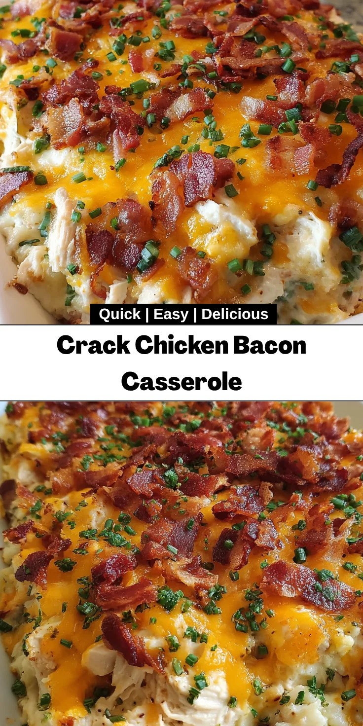 Crack Chicken Bacon Casserole is a comforting and delicious dish made with shredded chicken, creamy ingredients, and topped with bacon and cheese.