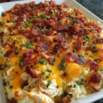 Sprinkle the remaining cheddar cheese and crumbled bacon evenly over the top. Layering these ingredients not only enhances the taste but also creates a beautiful, golden crust. The melting cheese and crispy bacon will make your casserole irresistible!