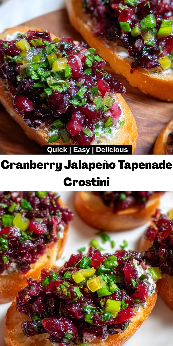 Every time I whip up these delightful **Cranberry Jalapeño Tapenade Crostini**, I’m reminded of the joy of cooking and sharing delicious moments with friends and family. The vibrant flavors, crunchy texture, and the little bit of heat make each bite a delightful adventure. This recipe not only saves me time but also sparks joy in conversations around the table. It has quickly become a staple at my gatherings. I hope it brings as much happiness to your home as it has to mine. So roll up your sleeves, put on that apron, and let the culinary fun begin!
