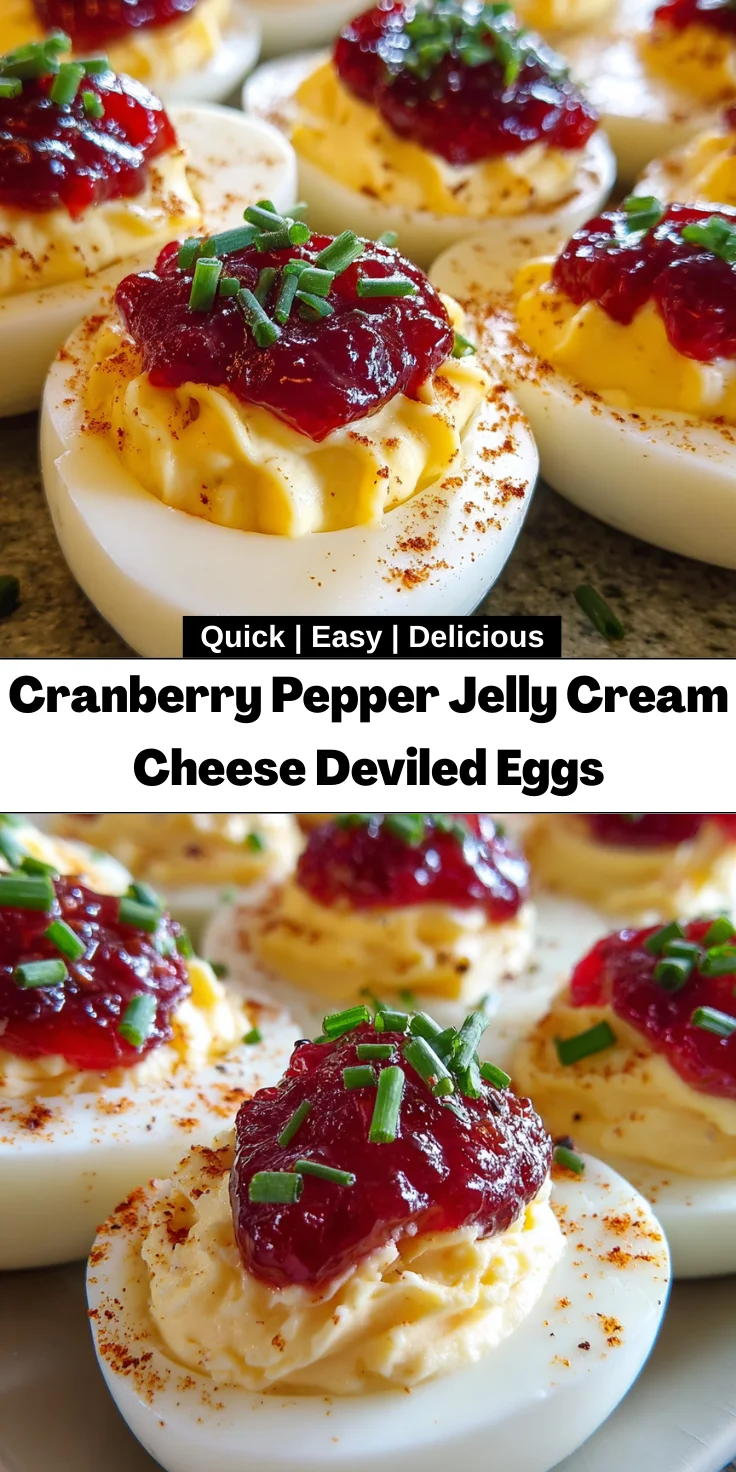 A delightful twist on traditional deviled eggs, featuring a creamy filling with cranberry pepper jelly for a sweet and spicy flavor.