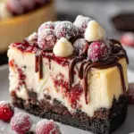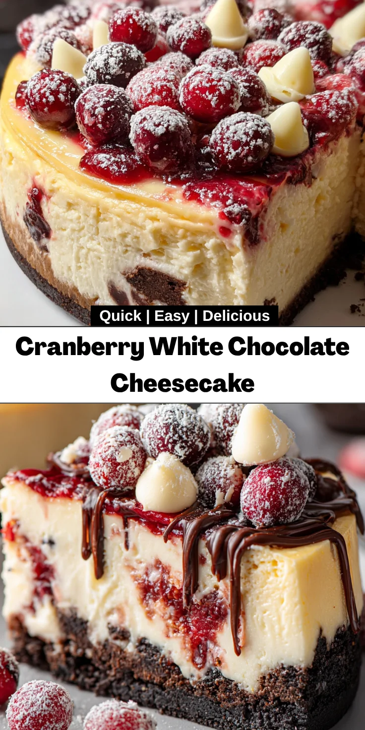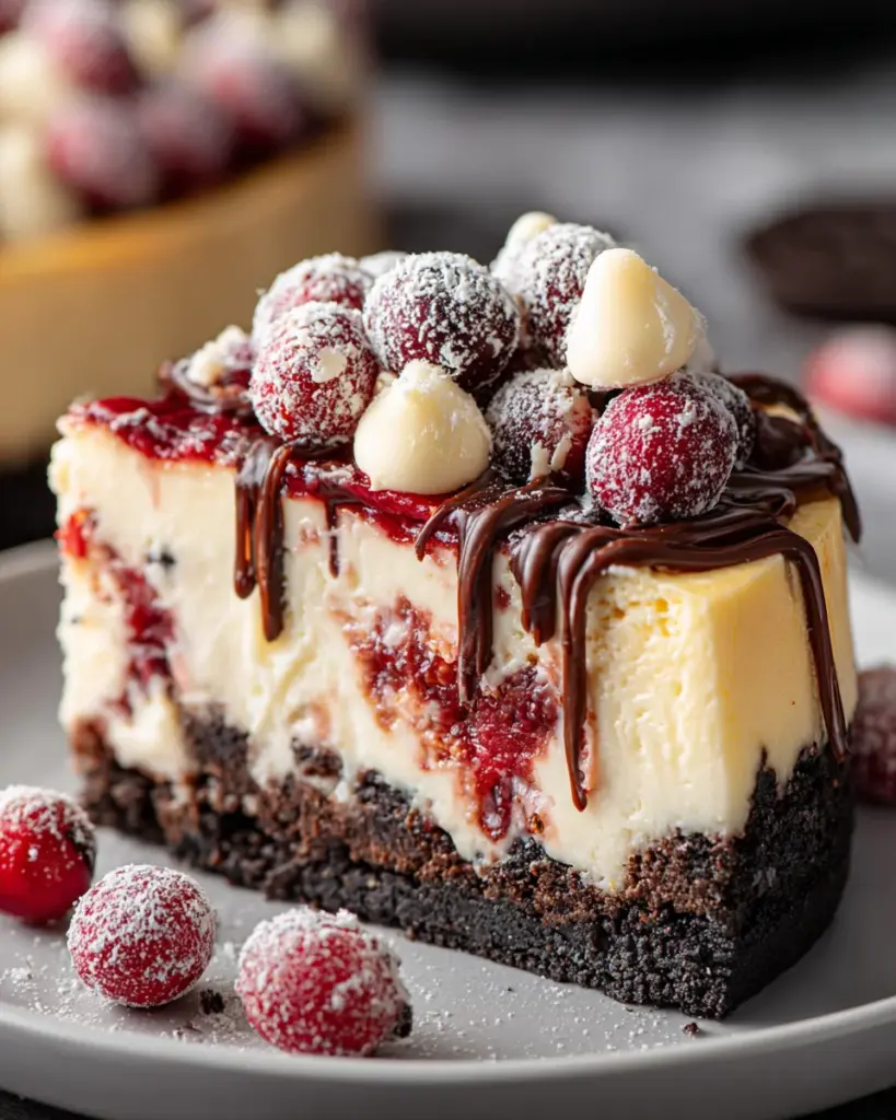 A rich and creamy cheesecake featuring tart cranberries and sweet white chocolate, perfect for festive occasions.