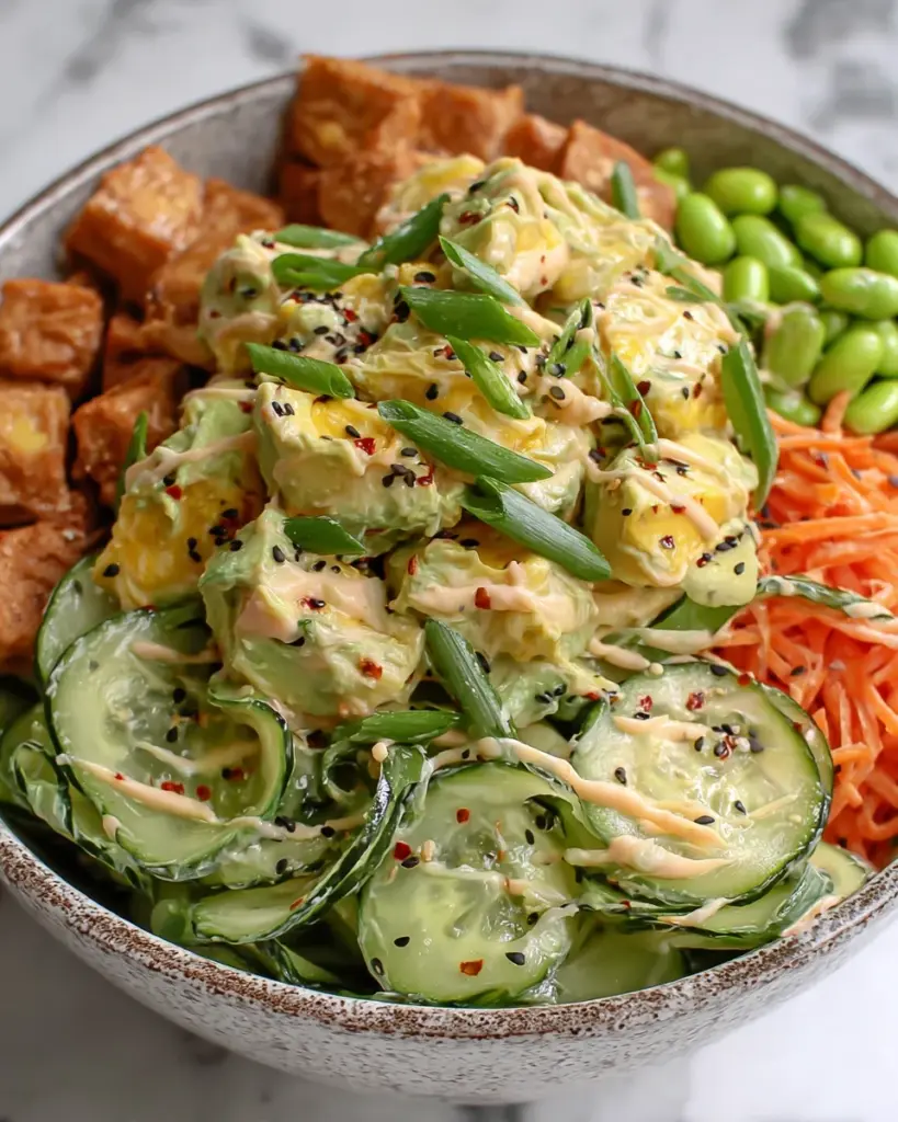 A refreshing and creamy bowl made with a variety of fresh vegetables and protein, topped with a flavorful dressing.