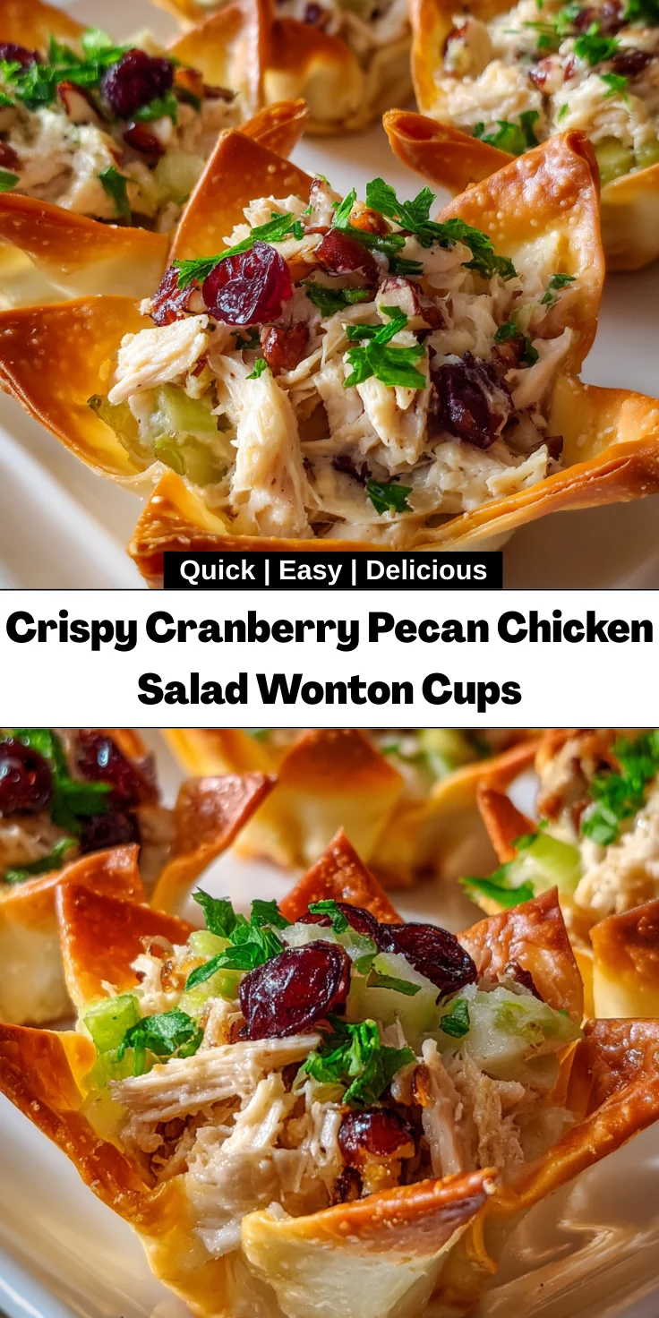 Hey there, fellow food enthusiasts! If you’re anything like me, you juggle a busy life while trying to whip up meals that not only satisfy but also impress. That’s where my Crispy Cranberry Pecan Chicken Salad Wonton Cups come in! These bite-sized delights are perfect for a quick solution after a long day or a party appetizer that’ll leave your guests raving. With a crunchy wonton cup cradling a savory chicken salad, this recipe combines both flavor and texture in a fun package—it’s a win-win for any occasion!