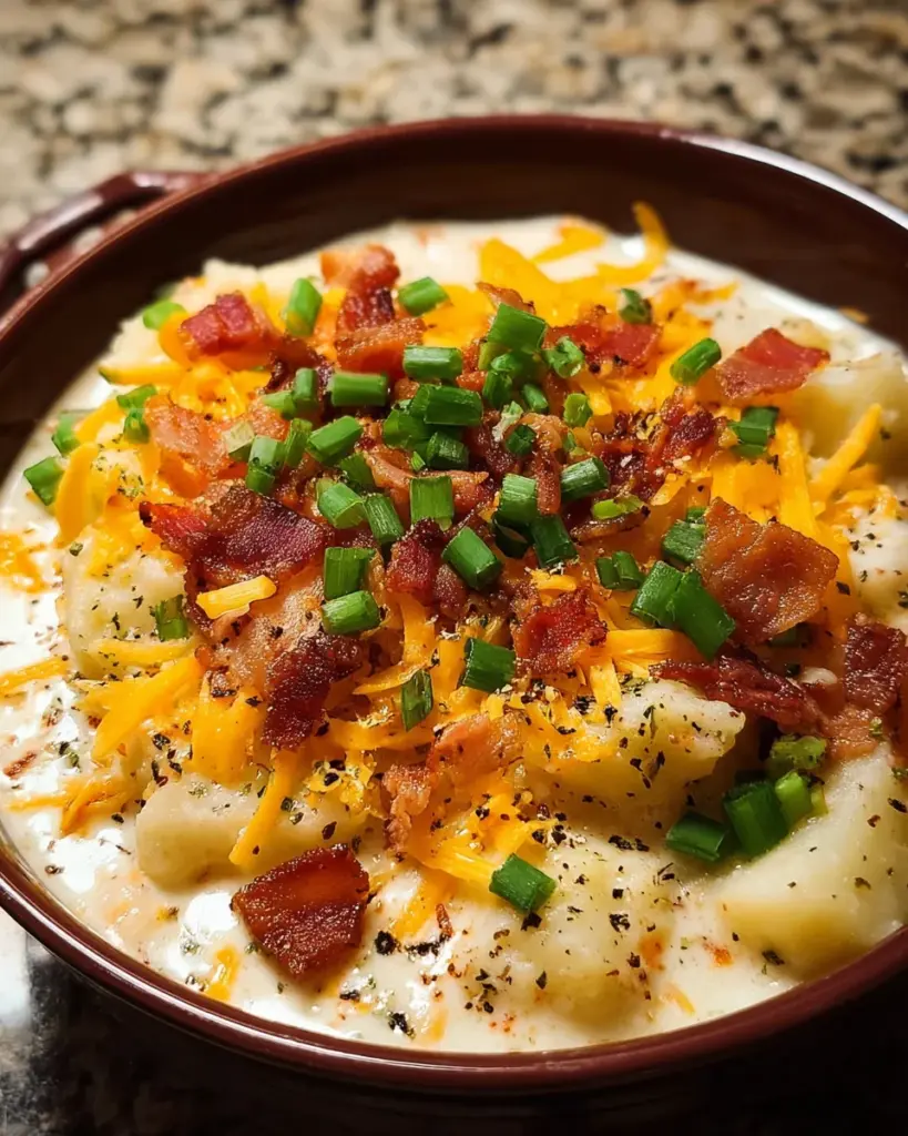 A creamy and flavorful potato soup made effortlessly in a slow cooker, featuring crispy bacon and cheesy goodness.