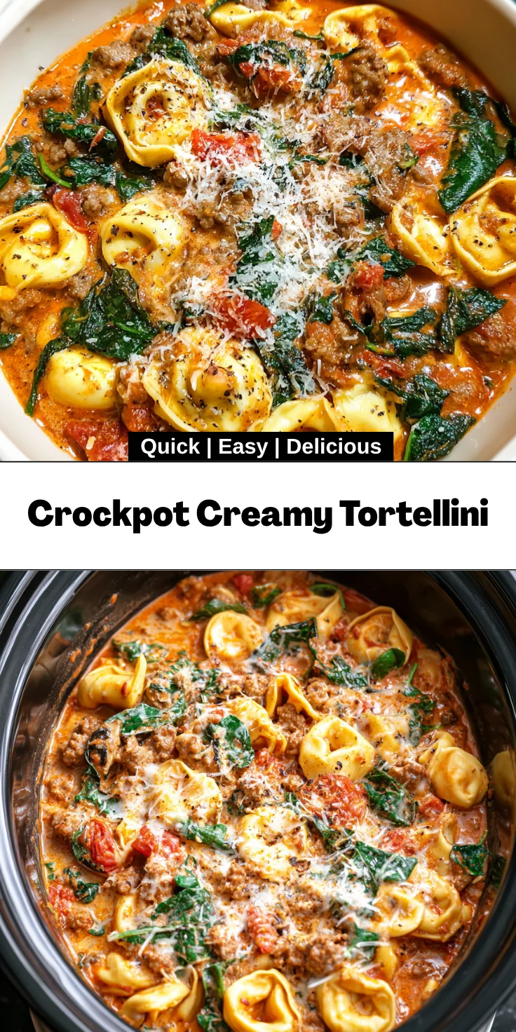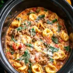 A creamy and savory tortellini dish cooked in a crockpot, featuring Italian sausage, fresh spinach, and a delightful blend of herbs.