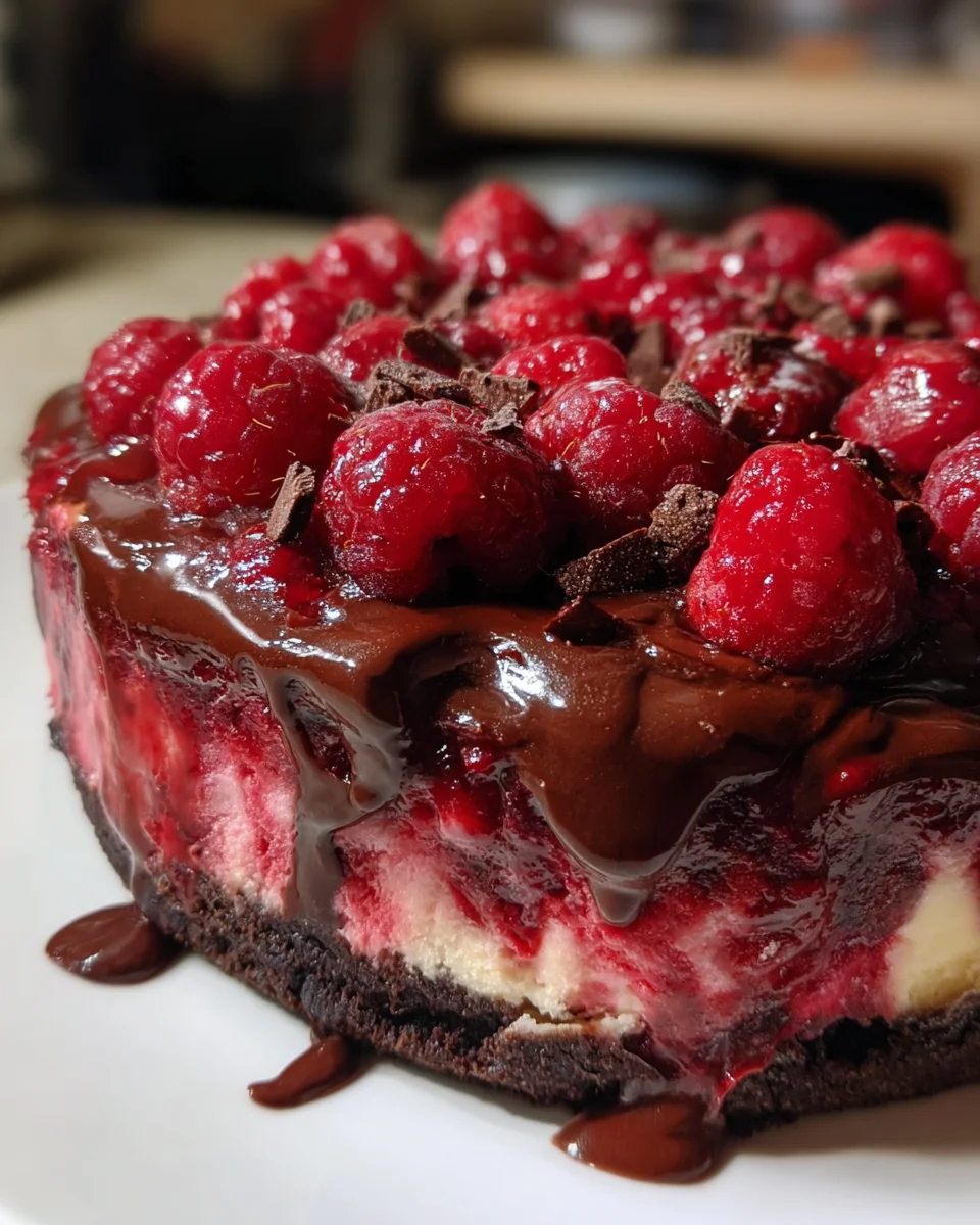 Indulge in the rich and creamy texture of this Dark Chocolate Raspberry Cheesecake, a perfect balance of chocolate and berries.
