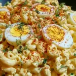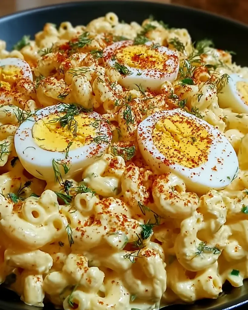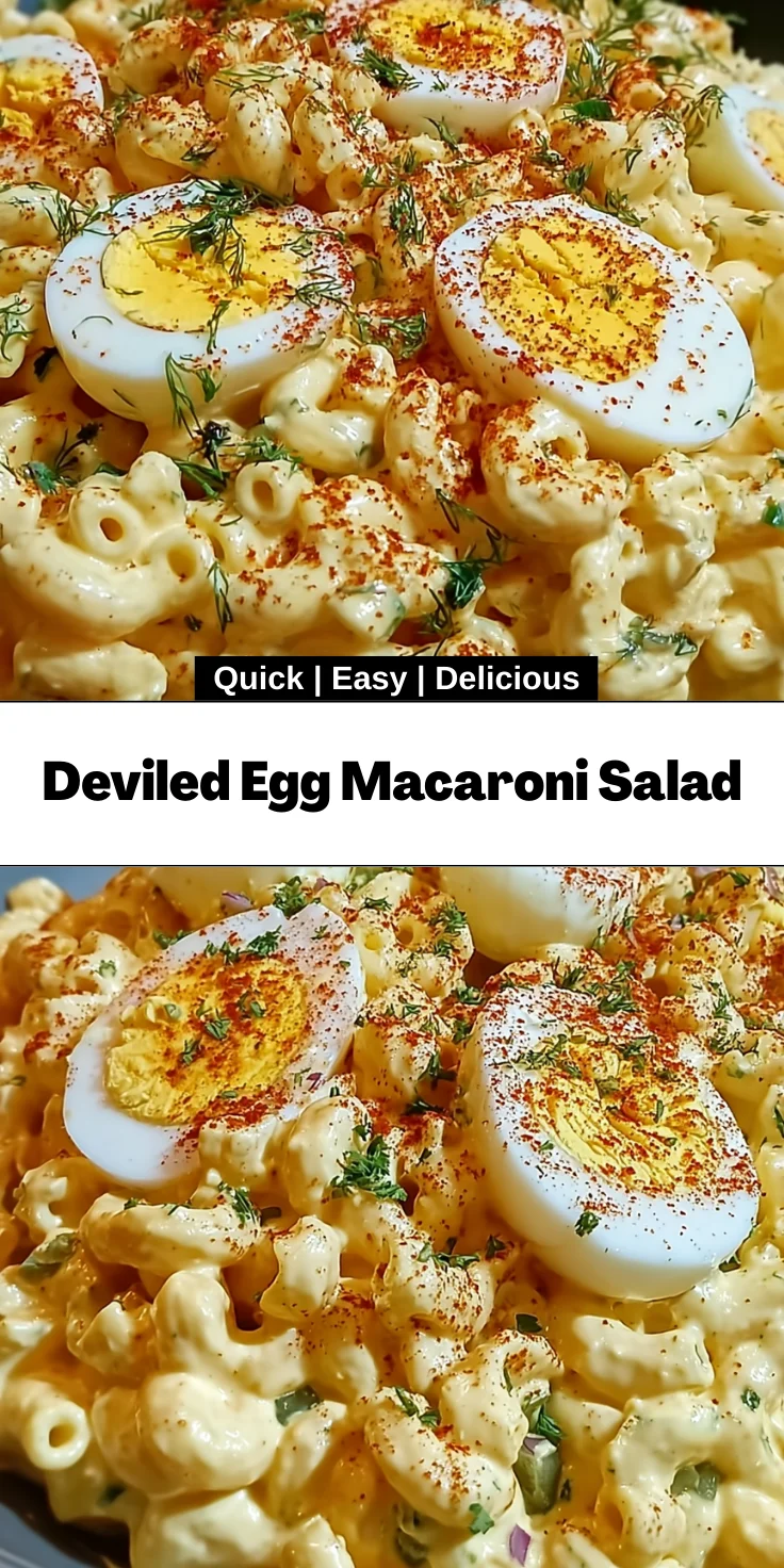 A creamy and delicious deviled egg macaroni salad combining the classic flavors of deviled eggs with pasta for a delightful side dish or meal.