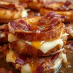 Now we’ll put everything together. Flip the toasted donuts so the cut side is facing up. Layer two slices of cheddar cheese on each bottom half. Then, crumble the crispy bacon over the cheese and drizzle that delicious maple mixture evenly on top. It looks so good already! Now, place the donut tops over everything and press gently to combine all those fantastic flavors.