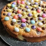 Here comes the excitement! Add the chocolate chips and 85 grams of those colorful assorted chocolate candies to your dough. Gently fold these in until evenly distributed, making sure every bite of your cake has a delicious surprise. You’ll want to see little flecks of chocolate peeking through for that visual wow factor! Trust me, this Easter Cookie Cake will be as pleasing to the eyes as it is to the taste buds.