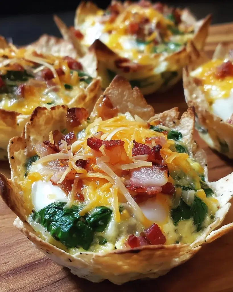 - Distribute finely chopped spinach evenly into each tortilla cup.