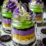 Now comes the layering art! Take your jars and start with a layer of green cake cubes. Next, sprinkle some crushed Oreos over them. Follow with a generous dollop of the cream cheese mixture. Then, add a layer of purple cake cubes and repeat the process. Keep going until your jars are filled with colorful layers!