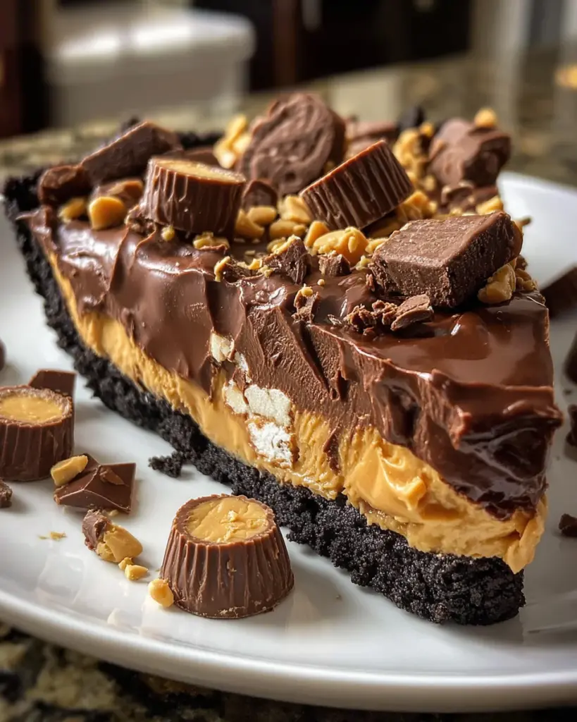 A deliciously indulgent dessert that combines a chocolate crust, creamy peanut butter filling, and a rich chocolate ganache topping, perfect for peanut butter lovers.