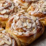 - While the rolls cool, make the frosting by whisking together powdered sugar, melted butter, heavy cream, milk, and almond extract until smooth. Pour the frosting over the warm rolls, sprinkle with sliced almonds, and enjoy!