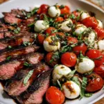 A delicious grilled flank steak paired with a fresh Caprese salad, combining flavors of garlic, tomatoes, and mozzarella.