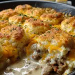 A comforting and easy-to-make casserole featuring hash browns, sausage, and biscuits topped with gravy and cheese.