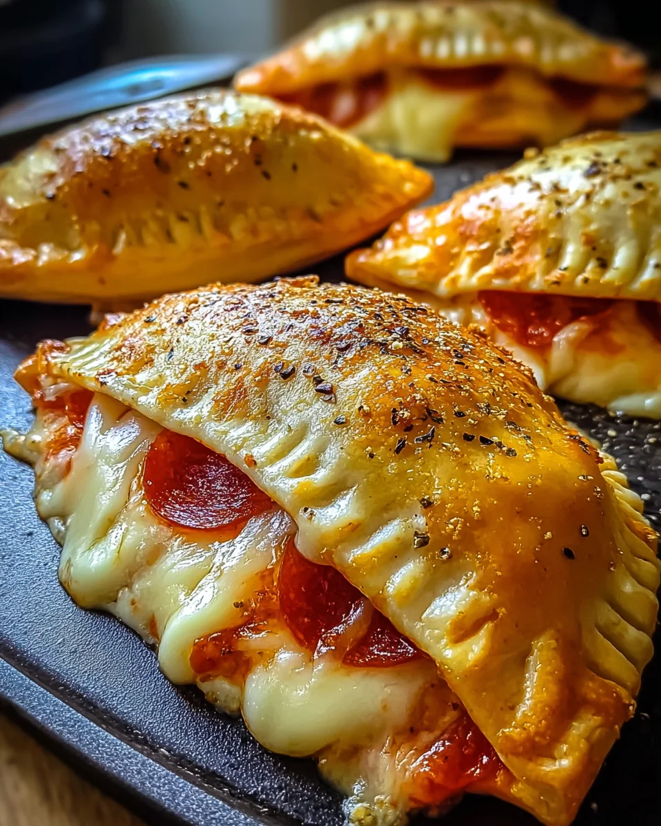 Delicious homemade cheesy pizza pockets filled with mozzarella, pepperoni, and pizza sauce, baked to perfection.