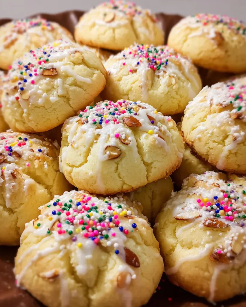 Once the cookies have cooled completely, dip the tops into the glaze, and then get creative with sprinkles! Scatter them on before the glaze sets to add a colorful touch. Your Italian Ricotta Almond Cookies are now ready to impress!