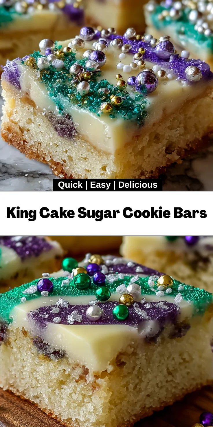 King Cake Sugar Cookie Bars are a festive treat inspired by the traditional King Cake, combining a soft sugar cookie base with a sweet icing and colorful decoration.