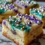 Finally, it’s time for that festive flair! Immediately sprinkle the sanding sugar over the icing. Think purple, green, and gold for a true Mardi Gras celebration! Not only does it look stunning, but it also complements the sweetness of the icing beautifully. Let it set for about 30 minutes before slicing into bars.