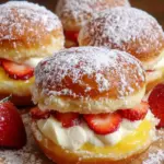 Take each cooled donut and slice it horizontally. Pipe a generous layer of your creamy filling onto the bottom half, then spread a dollop of lemon curd on top. For an extra burst of flavor, add slices of fresh strawberries. Finally, finish with another layer of cream and place the top half back on. Look at those beauties—they’re almost too pretty to eat!